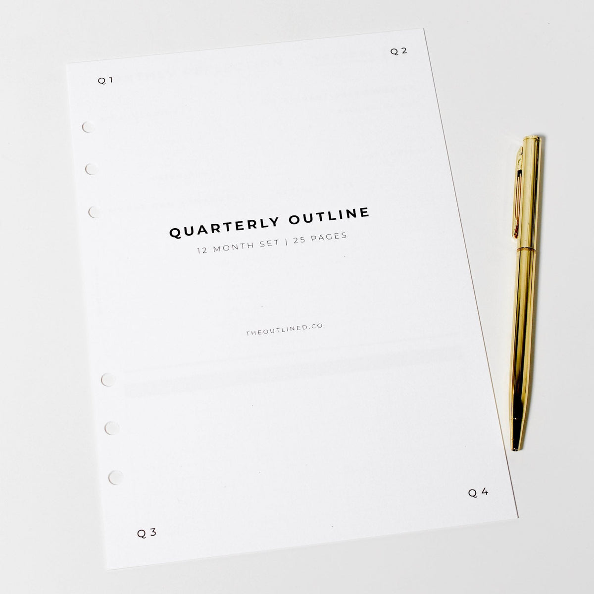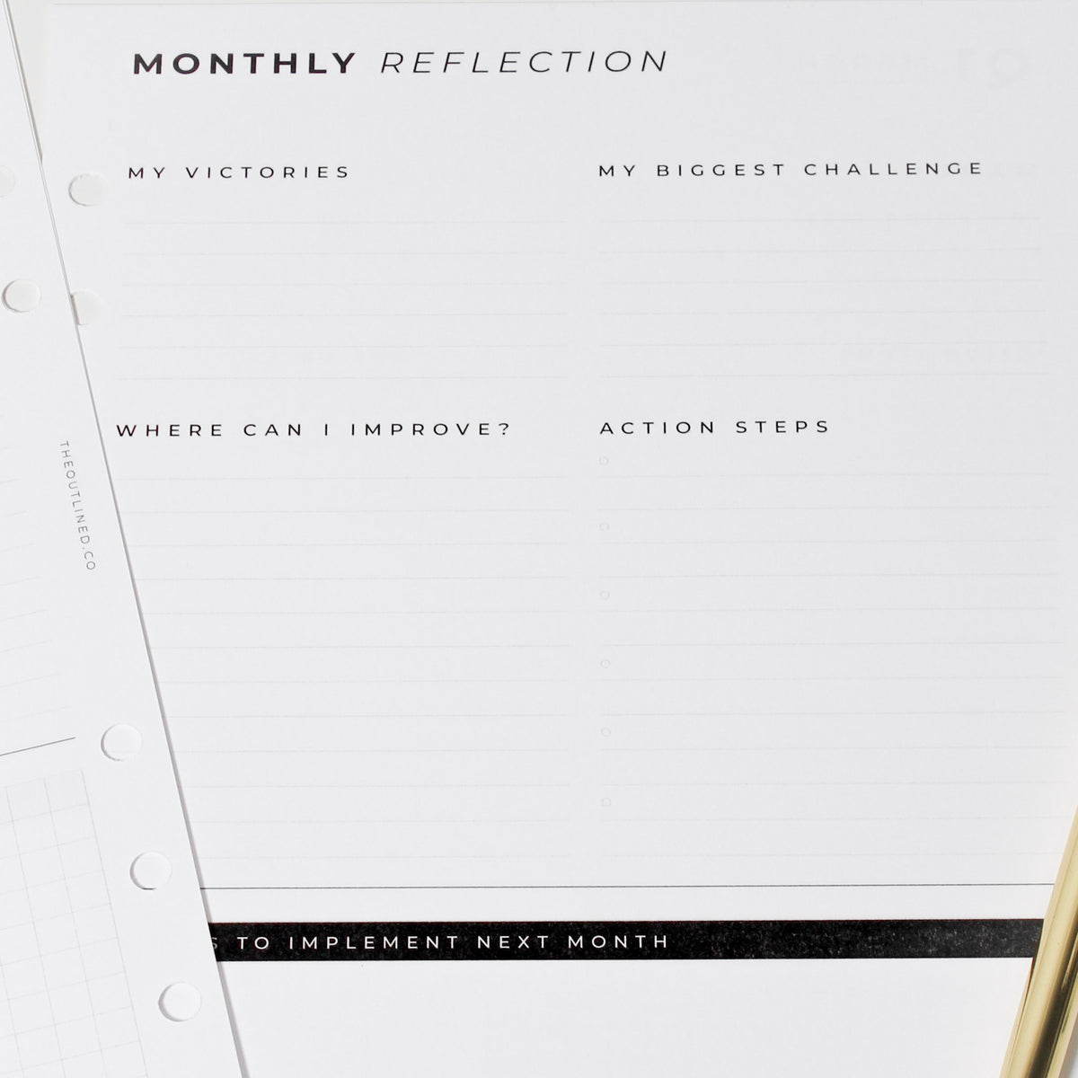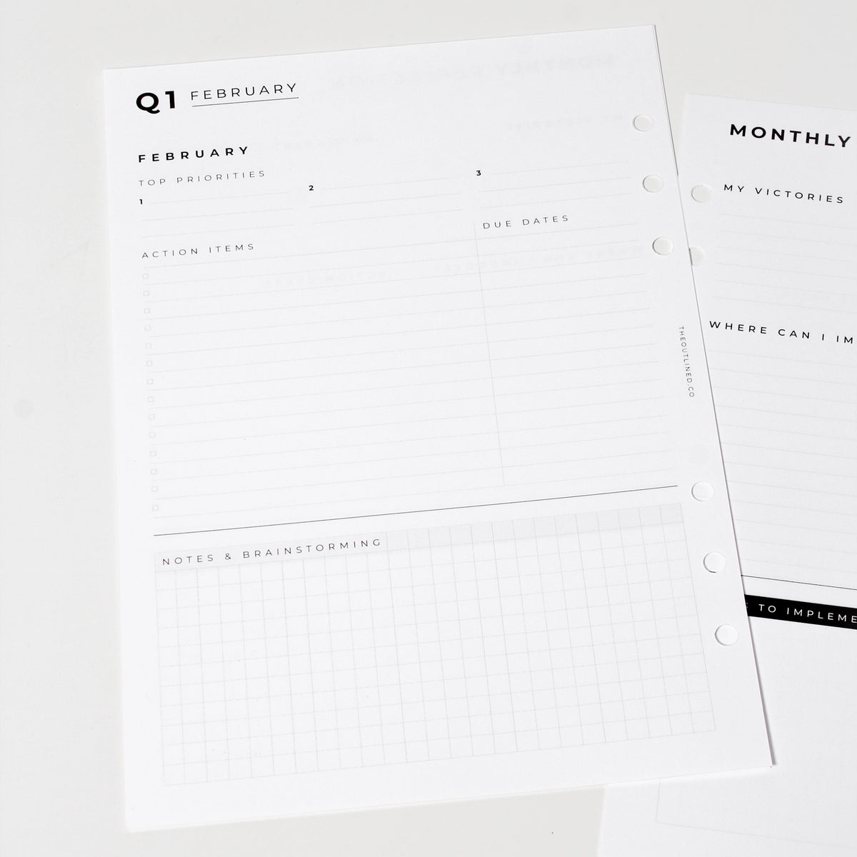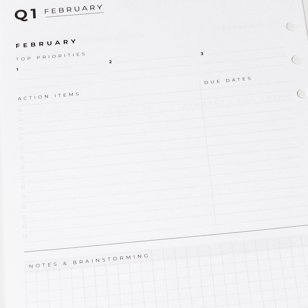 Plan your biggest goals with ease using the Quarterly Outline Inserts. Instead of tackling broad, long-term goals for the entire year, this system helps you break down larger objectives into focused 12-week cycles. This approach keeps you on track, allows for quick adjustments, and makes every week count. The 12-month set includes dedicated sections for prioritizing tasks, tracking action items, setting due dates, and more. Each month concludes with a reflection page to celebrate wins, address challenges, identify areas for growth, and stay motivated!