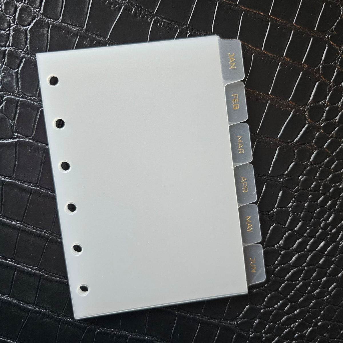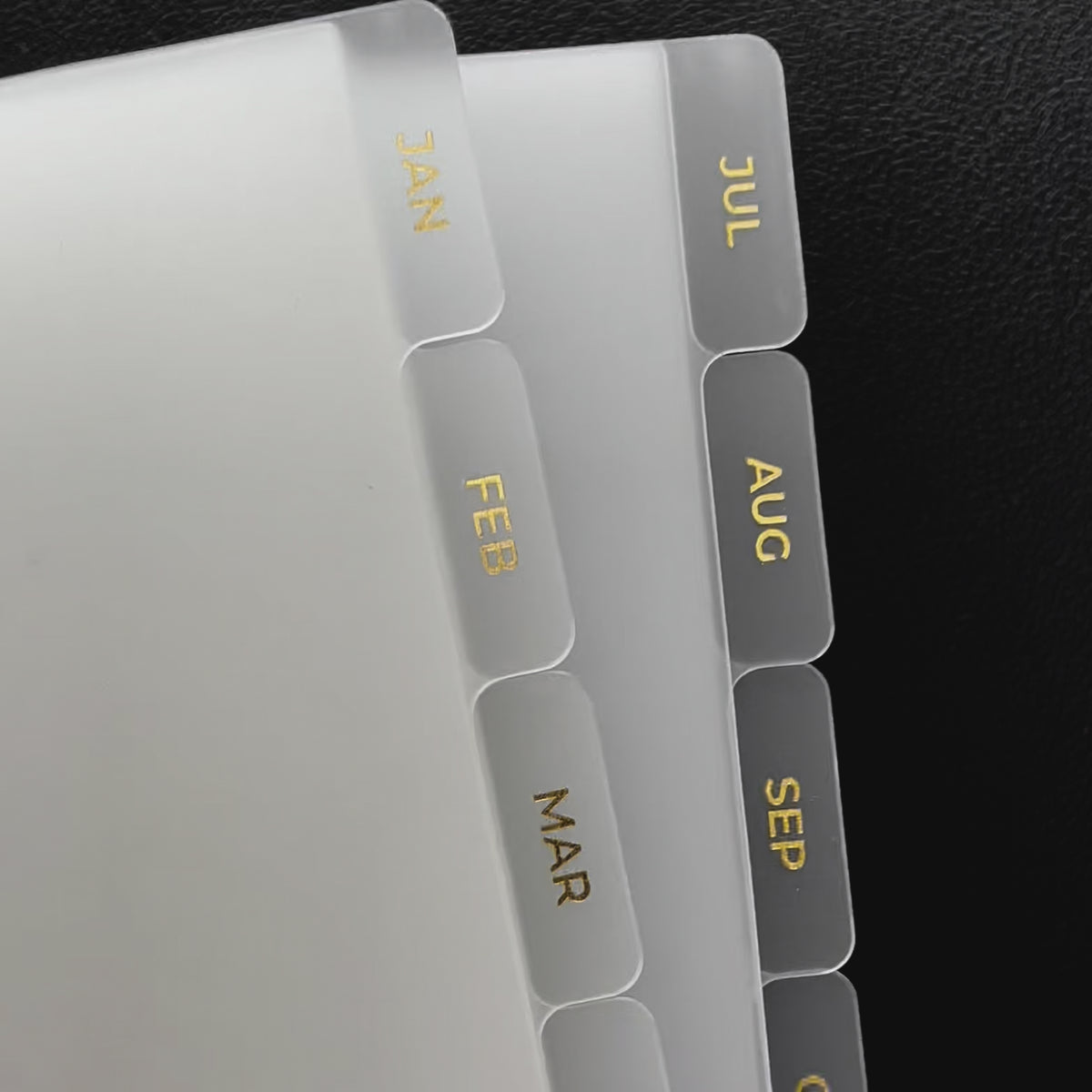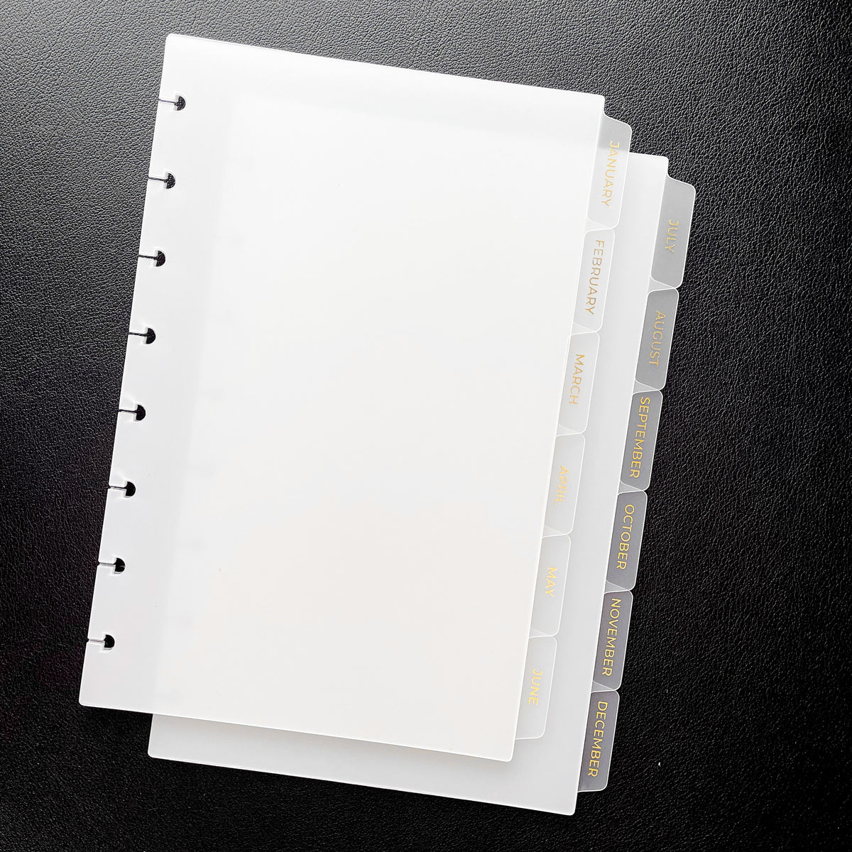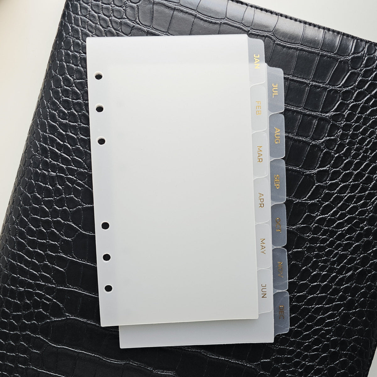 Keep your planner organized and elegant with this set of 12 monthly side tab dividers. Made from durable clear frosted plastic and finished with luxe gold foil text, these dividers make it easy to flip between months at a glance.