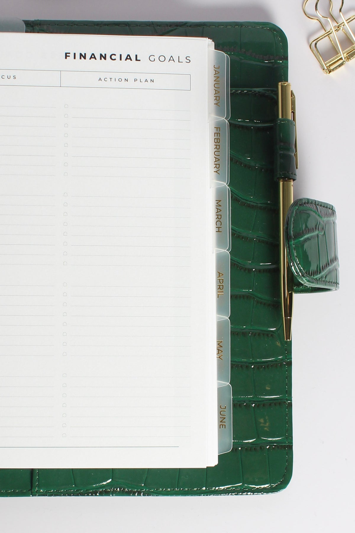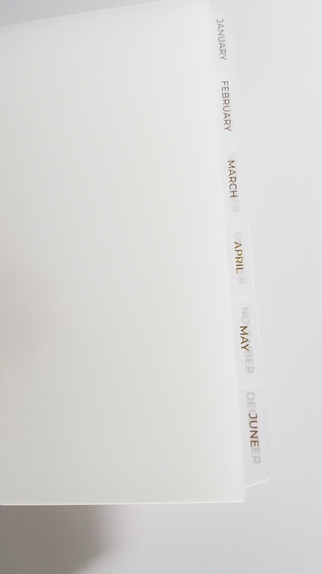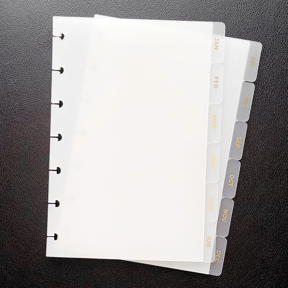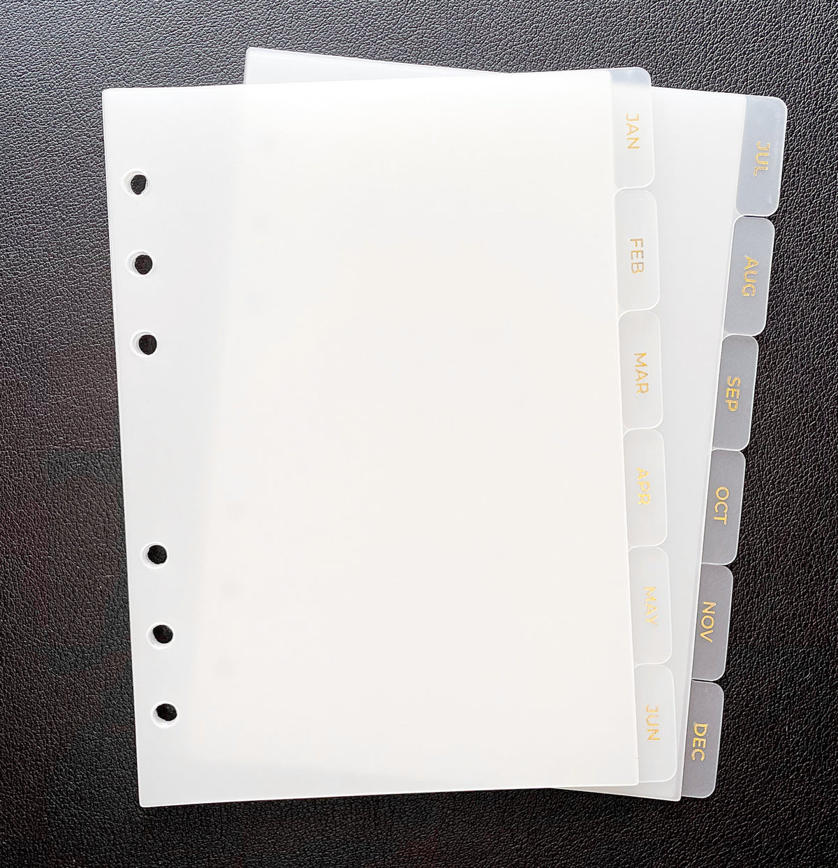 Keep your planner organized and elegant with this set of 12 monthly side tab dividers. Made from durable clear frosted plastic and finished with luxe gold foil text, these dividers make it easy to flip between months at a glance.