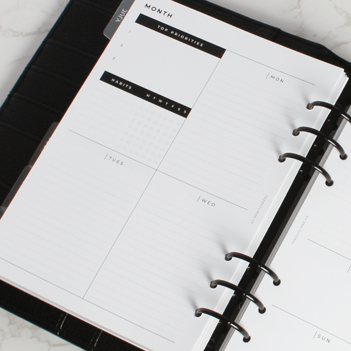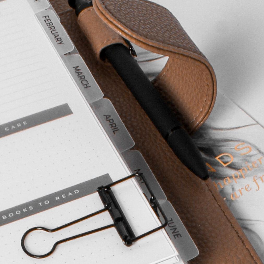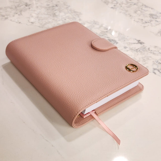 Covered in smooth pebbled vegan leather, this bundle includes an A5 binder, pages, dividers, and bookmark, all customizable with your choice of binder and ring color. The perfect balance of simplicity and style!